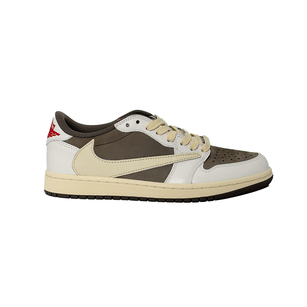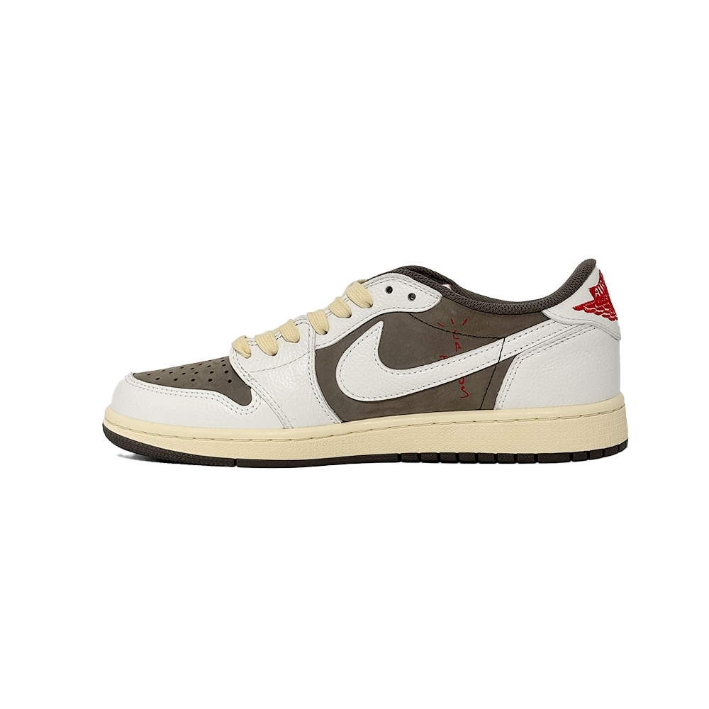 • ویژگی‌ها: این اولین و شاید نمادین‌ترین همکاری ایر جردن 1 با تراویس اسکات است که سووش برعکس قهوه‌ای، رویه چرمی سفید و مشکی و جیب مخفی را معرفی کرد.