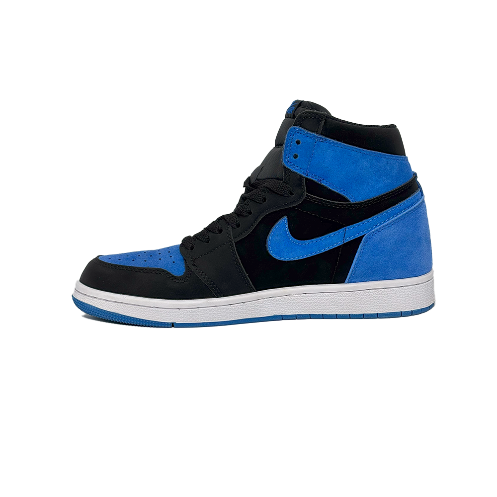 - متریال جدید: تفاوت اصلی این نسخه با “Royal” اصلی، استفاده از جیر (suede) با کیفیت بالا به جای چرم سنتی است. در این مدل، پنلهای مشکی از جنس نوبوک (nubuck) و قسمتهای آبی روی تو-باکس، سووش، پاشنه و یقه کفش از جیر نرم ساخته شدهاند. این ترکیب متریال، ظاهری مدرن و لوکس به کفش میبخشد.